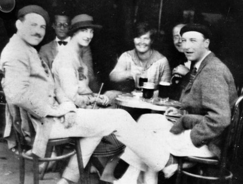 Ernest Hemingway in de zomer van 1925 in een Spaans café in Pamplona, in het gezelschap van de personen die hij afbeeldde in zijn roman "The Sun Also Rises". Van links naar rechts, zittend: Hemingway, Harold Loeb, Lady Duff Twysden, Hadley, Don Stewart en Pat Guthrie (https://nl.wikipedia.org/wiki/The_Sun_Also_Rises)